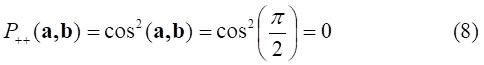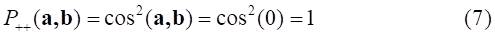 Как и для шаров рассмотрим характерные (крайние) значения угла между поляризаторами. Если угол (a, b) между измерительными осями поляризаторов равен нулю, то на их выходе фотоны всегда будут иметь одинаковую поляризацию с единичной вероятностью, то есть всегда будут регистрироваться пары соответствующими датчиками+ на обоих анализаторах: