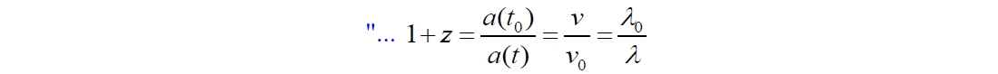 Все величины, помеченные индексом 0, относятся к моменту приёма волны . Так как в расширяющейся Вселенной , то и длина волны принимаемого сигнала больше, чем излучённого. Величина , называемая параметром красного смещения, равна относительному увеличению длины волны принимаемого электромагнитного сигнала" [4].