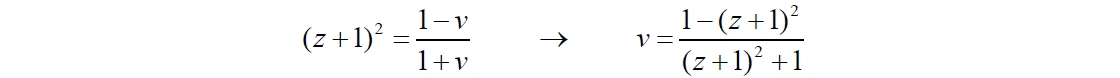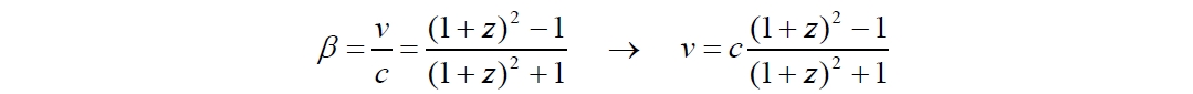 Из этого уравнения (4) можно вывести соотношение между скоростью и красным смещением. В цитате мы добавили номера к формулам (0), (1) и (4), которые в оригинале отсутствуют. Если взять левое равенство уравнения (1) из приведённой цитаты: