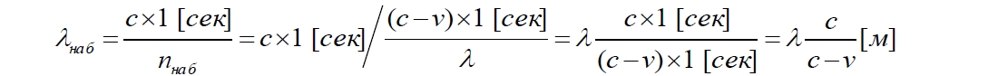 Все эти периоды подсчитаны за то же время – 1 секунду, что "видно" с точки зрения излучателя (источника). Действительно, наблюдая за движущимся наблюдателем, приёмником, он однозначно фиксирует, что тот пересчитал именно такое количество "периодов" волны. Из этого следует, что при световой скорости движения волны этому количеству периодов nнаб соответствует и большее значение длины волны (длины её одного периода). В самом деле, за 1 секунду мимо движущегося наблюдателя пробежало nнаб штук периодов общей длиной, равной пути, пройденному светом за это же время, 1 секунду. Следовательно, фактическая длина волны с точки зрения движущегося (да и неподвижного) наблюдателя равна: