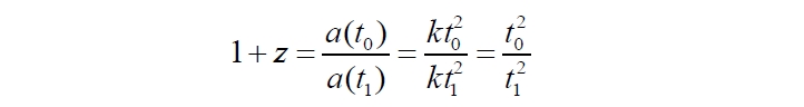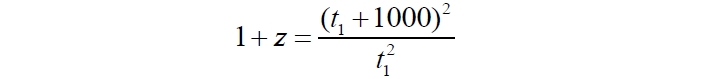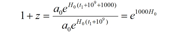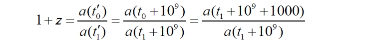 Теперь произведёт такие же измерения, спустя 109 лет. В этом случае, с учётом моменты наблюдений возрастут до: t0' = t0+109 и t0' = t1+109. Соответственно, за такой же интервал наблюдений – 1000 лет, то есть мы получим значение красного смещения: