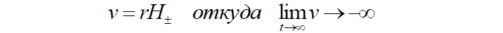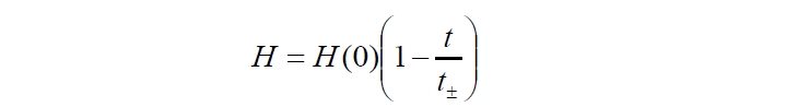Из уравнения мы видим, что в некоторый момент времени t± параметр Хаббла становится равным нулю, то есть, Вселенная перестаёт расширяться, становится стационарной. Далее параметр становится отрицательным, а Вселенная начинает сжиматься, причём на бесконечности – до нулевых размеров. Закон Хаббла с таким характером уменьшения параметра Хаббла можно записать в следующем виде