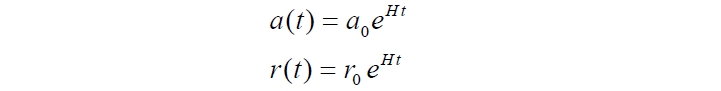 Неясным оказался и вопрос о связи переменного параметра Хаббла и характером расширения Вселенной: ускоренным или замедленным. Хотя ответ видится достаточно очевидным, но по нему нередко возникают довольно жаркие дискуссии. Например, в одной такой дискуссии бы предложен весьма красивый и поучительный пример. Предложено уравнение масштабного фактора, явно стремительно возрастающего во времени: