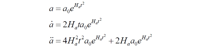 Как видим, значение ускорения равно нулю, что и означает равномерное расширение Вселенной, без ускорения. Теперь приведём пример масштабного фактора с некоторым условным параметром Хаббла, соответствующим ускоренно расширяющейся Вселенной: