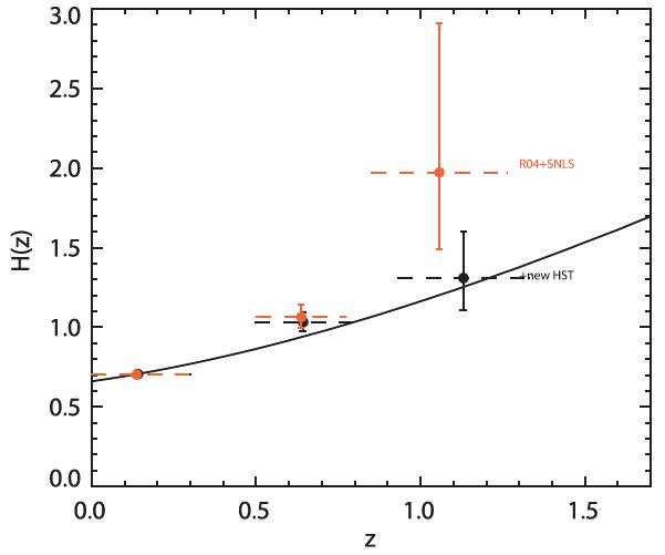 "… положительный или отрицательный знак наклона данных указывает на замедление или ускорение расширения соответственно". Рисунок из статьи [1]