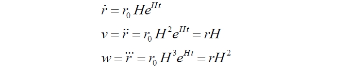 В качестве примера определим параметр космологического ускорения wH для Вселенной, расширяющейся с неизменным значением параметра Хаббла. Запишем совместно, одним блоком уравнения масштабного фактора и его производных: