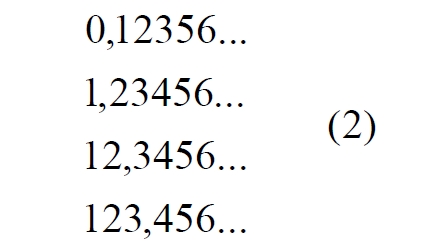 Как утверждается со ссылкой на методологию счета Кантора, множество всех действительных чисел несчетно, то есть, невозможно их пересчитать, присвоив каждому из них некоторое натуральное число – номер, поскольку всегда останутся непронумерованные числа [3, с.73-74]. Вообще-то, на первый взгляд, интуитивно это выглядит вполне очевидно. Рассмотрим, например, следующую явно бесконечную последовательность действительных чисел: