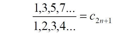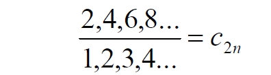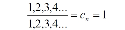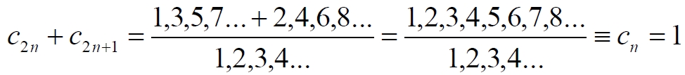 Это определённо означает, что мощности множеств всех натуральных чисел и суммы множеств всех четных и нечетных чисел равны. Но это также означает и тождественное равенство их бесконечного количества членов. Очевидно, что множества четных и нечетных чисел равномощны, поэтому, разделив полученное равенство на cn, получим: