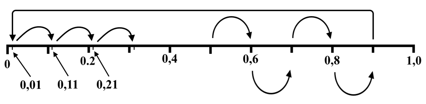 На рисунке показан фрагмент последовательной нумерации точек, начиная с точки 0,5 и заканчивая на точке 0,31. Мы последовательно рассматриваем фрагмент, точки с натуральными порядковыми номерами 5, 6, 7, 8, 9, 10, 11, 12, 13, по которым из выражения (3) определяем значения этих точек: 0,5 (точка номер 5); 0,6 (точка номер 6); 0,7 (точка номер 7 и так далее); 0,8; 0,9; 0,01 (точка номер 10); 0,11; 0,21; 0,31 (точка номер 13). Как видим, порядковые номера точек равномерно возрастают, но сами точки при этом "скачут" по линии. Отметим главное: фактическое значение точки "возникает" в самом процессе нумерации. То есть, сначала мы выбираем некоторый или очередной, натуральный порядковый номер точки, а затем определяем её местоположение на линии и присваиваем этой точке выбранный номер.