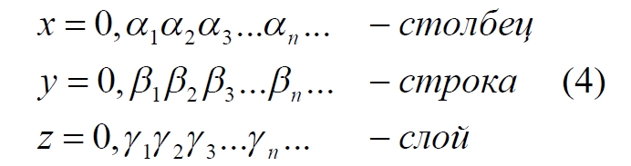 Такой же алгоритм можно использовать и для нумерации точек плоских или объемных, многомерных объектов, например, точек куба. В случае многомерных объектов номер преобразуется к виду (3) по методу Кантора, созданного им для отождествления точек линии и квадрата [3, с.77].