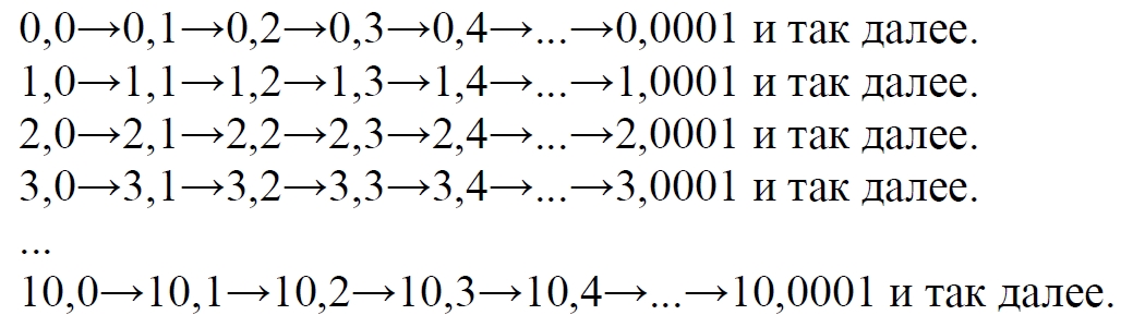 Нетрудно заметить, что такая запись содержит весь бесконечный ряд действительных чисел, причем слева (столбцом) и справа от запятой записаны независимые ряды в диапазонах значений от 0 до 1. Понятно, что ряд слева от запятой нужно читать справа налево, добавив в начале него 0 и запятую.