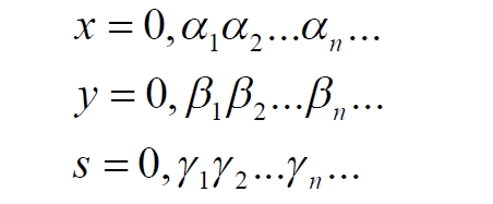 Для простоты, что, вообще-то, усложняет наше опровержение, ослабляет его, возьмём значения этих координат в кратчайшем виде, в виде единственной цифры от 0 до 9 без последующих дополнительных нулей, что во много раз увеличит число таких комбинированных точек, принадлежащих каждому квадрату. Для определенности возьмем в кубе 10 сечений, причем имеющие точное значение координаты s = 0; 0,1; 0,2 … 0,9. Теперь создадим по методу Кантора новые числа для точек каждого квадрата. Согласно этому методу каждая точка квадрата будет описываться новым числом – индексом. Исходные координаты задаём в следующем формате: