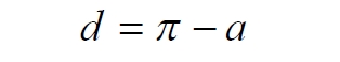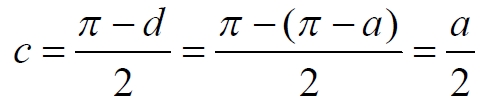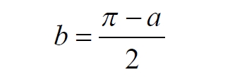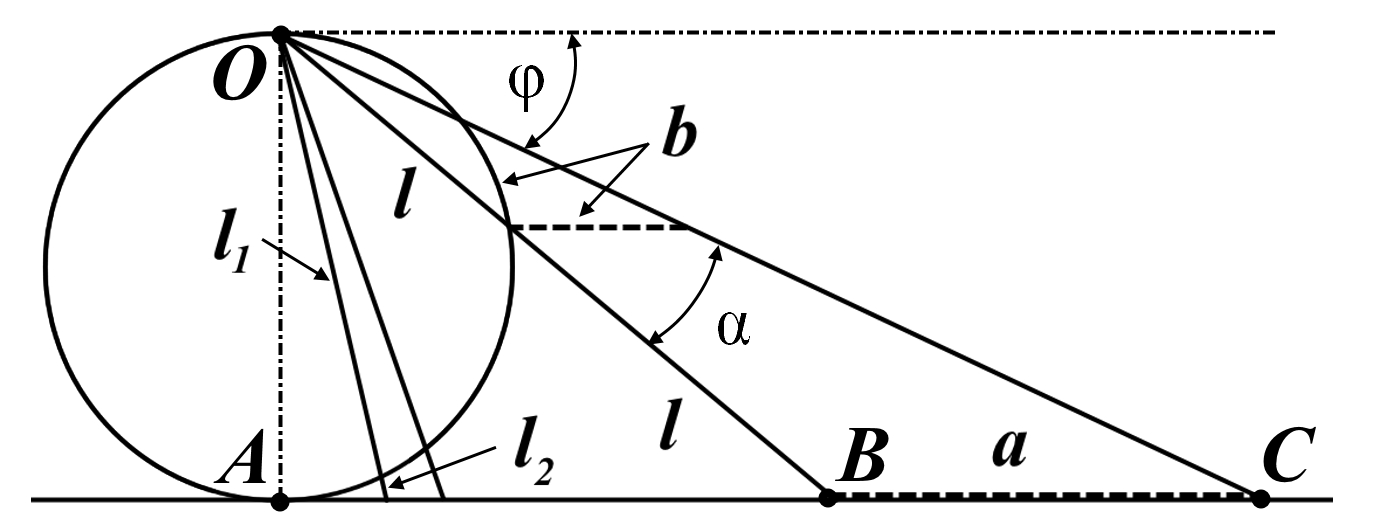 Мы не описываем сущность стереографической проекции, её описание можно найти в литературе. Каждая проекционная линия, прямая делится проецируемой точкой окружности между полюсом и проекционной плоскостью на две части, например, l1 и l2. Возьмем частный случай, когда отрезок делится пополам, то есть, l1 = l2 = l. Проведем ещё одну проекционную линию под углом α к исходной линии. В этом случае на окружности образуется дуга, а на плоскости – отрезок. Проведем из проецируемой точки пересечения дополнительный отрезок между проекционными лучами параллельно плоскости из проецируемой точки. Обозначим полученный отрезок через b, а проекцию на плоскости – через a. Из подобия треугольников следует, что