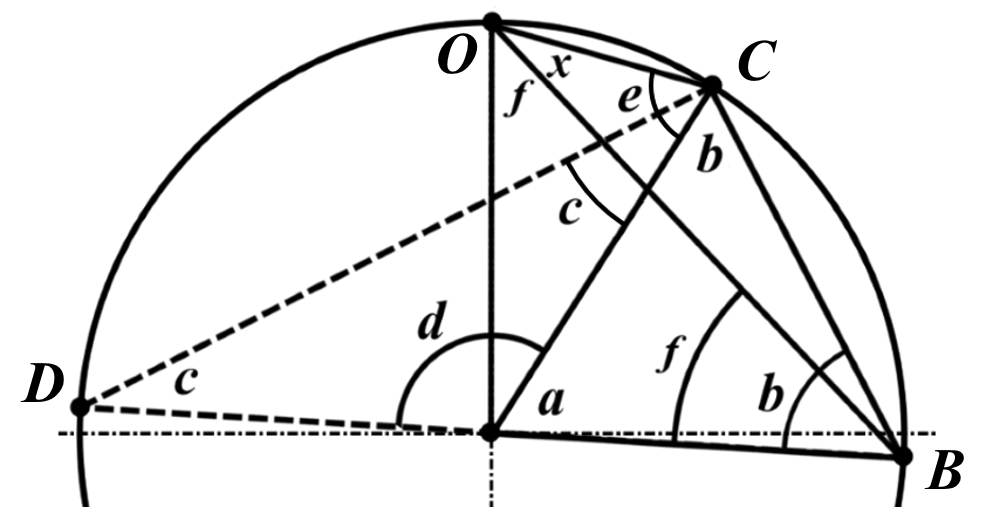 Итак, возьмем на окружности рис.4 некоторую произвольную дугу CB и проведем к ней две пары лучей – из центра и из полюса О. Проведем далее вспомогательный диаметр BD и линию CD. Обозначим одинаковыми буквами равные углы в равносторонних треугольниках у равных сторон. По условиям задачи нам задан некий центральный угол a. Докажем, что а = 2x. Из построений на рисунке видим: