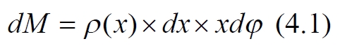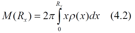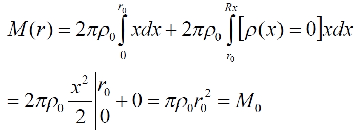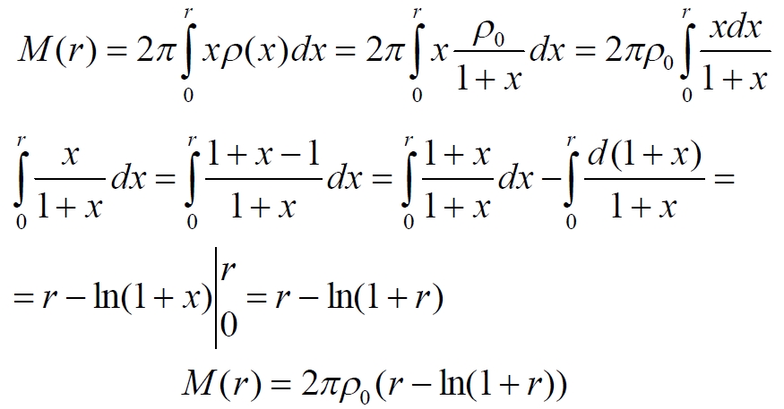 Найдём частичную массу диска, его внутренней дисковой части некоторого радиуса Rx, то есть, радиальное распределение массы. Эта масса, очевидно, нарастающая, чем больше радиус Rx, тем больше масса. Используя дифференциал (4.1), массу можно найти интегрированием, указав радиус диска R0 в качестве верхнего предела интеграла по радиус-вектору