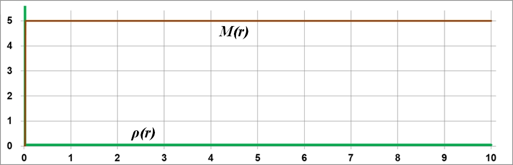 Рассмотрим три принципиальных случая, определяемых законом изменения плотности. Первый случай, который можно назвать кеплеровским, – вся масса диска находится в его центре, плотность диска – "пиковая" ρ(0)= ρ0. Численное интегрирование даёт такой вид функции массы