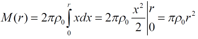 В этом случае масса каждого частного диска одна и та же и равна массе, находящейся в его центре. Для наглядности и удобства вычислений интеграл в общем виде (4.2) для этого случая желательно изменить, а точнее, разделить на два интеграла. Масса такого диска сосредоточена в его центре и, очевидно, имеет некоторый минимальный объём, радиус r0. В остальных точках плотность равна нулю, поэтому