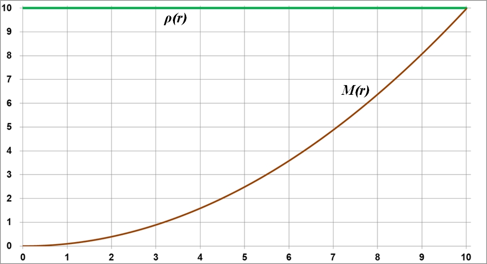 Итог аналитического интегрирования означает, что при такой однородной плотности каждый промежуточный диск имеет массу, пропорциональную квадрату его радиуса. Численное интегрирование также показало на диаграмме параболу, то есть, графический результат совпал с аналитическим