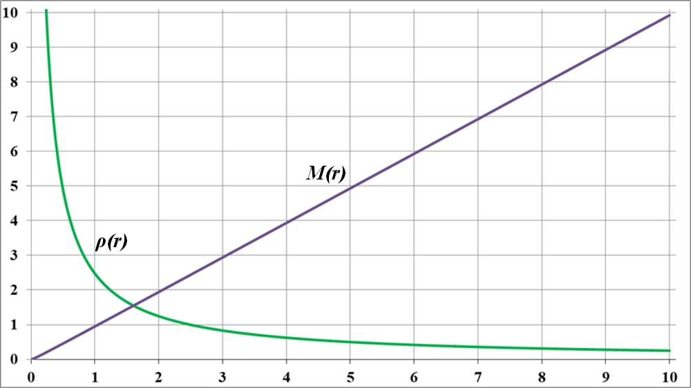 Рис.4.3. В диске с гиперболически уменьшающейся от центра к периферии плотностью, массы всех частичных, вложенных дисков растут прямо пропорционально их радиусам