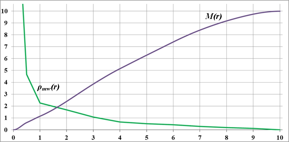 График показывает величину массы частичного диска, заключенной в круге соответствующего радиуса. Полная масса диска на рисунке равна 10. Отметим её некоторые особенности. Вблизи центра диска, области, имеющей предельную плотность, сосредоточена всего лишь десятая часть его полной массы. Действительно, плотность в пике этой части равна 50, то есть, почти в 100 раз превышает плотность на половине радиуса диска, равную 0,5. Масса половины диска по радиусу составляет всего 65% от общей массы. Напротив, половина массы диска сосредоточена в пределах радиуса 40%.