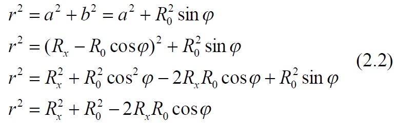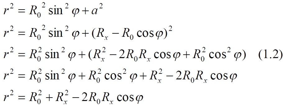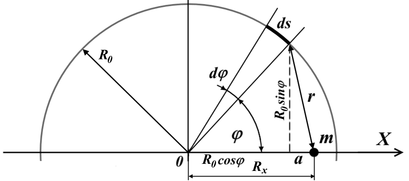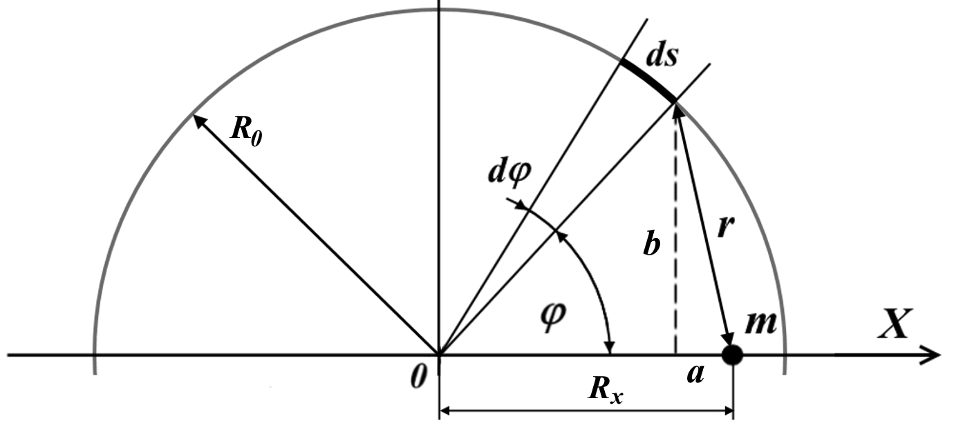 Мы принимаем, что масса участка определяется неизменной поверхностной плотностью сферы. Поскольку мы приняли, что сфера имеет нулевую толщину, то вместо объёма сразу же указываем площадь. Дифференциал площади мы уже определили (2.1), теперь определим расстояние между объектом и этим участком сферы. Как видно на рисунке, оно описывается уравнением