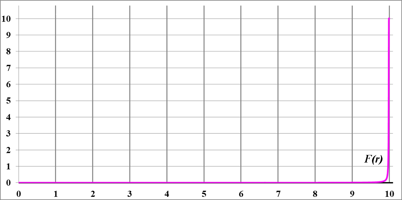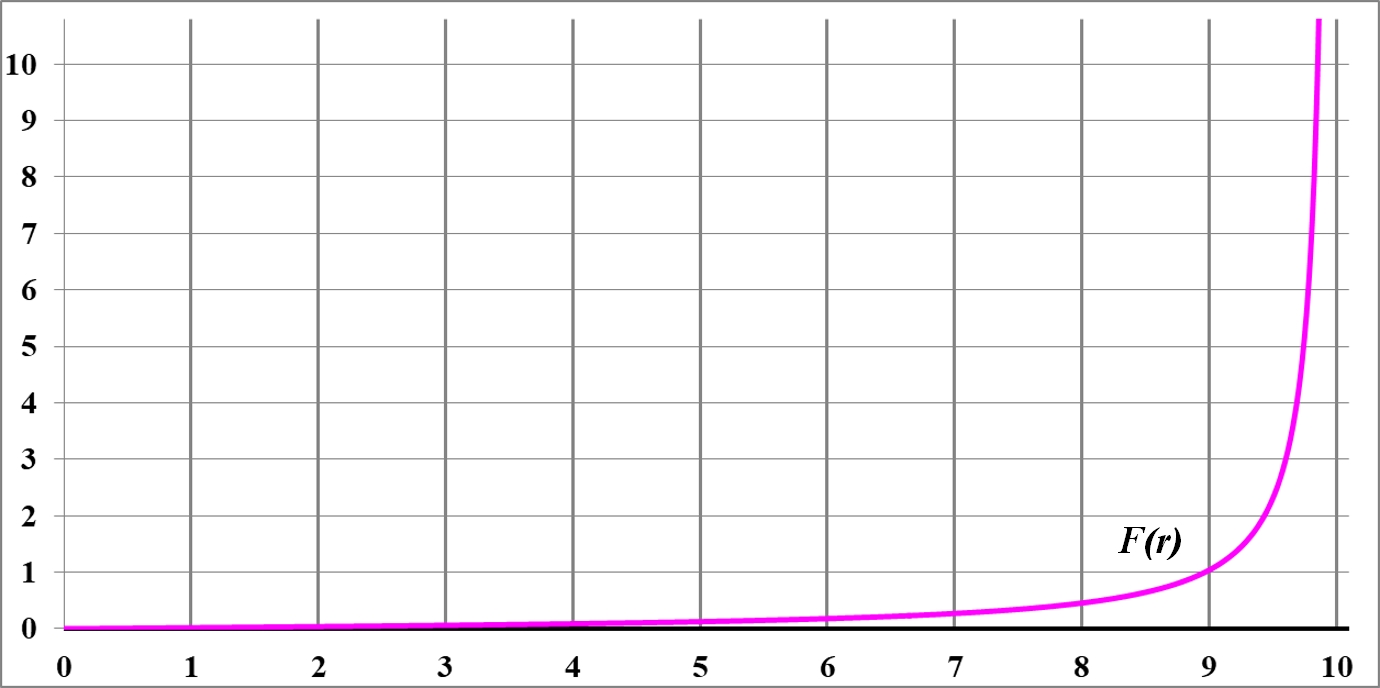 Рис.1.5. График изменения силы притяжения внутри обруча пробного тела в зависимости от его удалённости от центра. Максимальные значения отсечены.