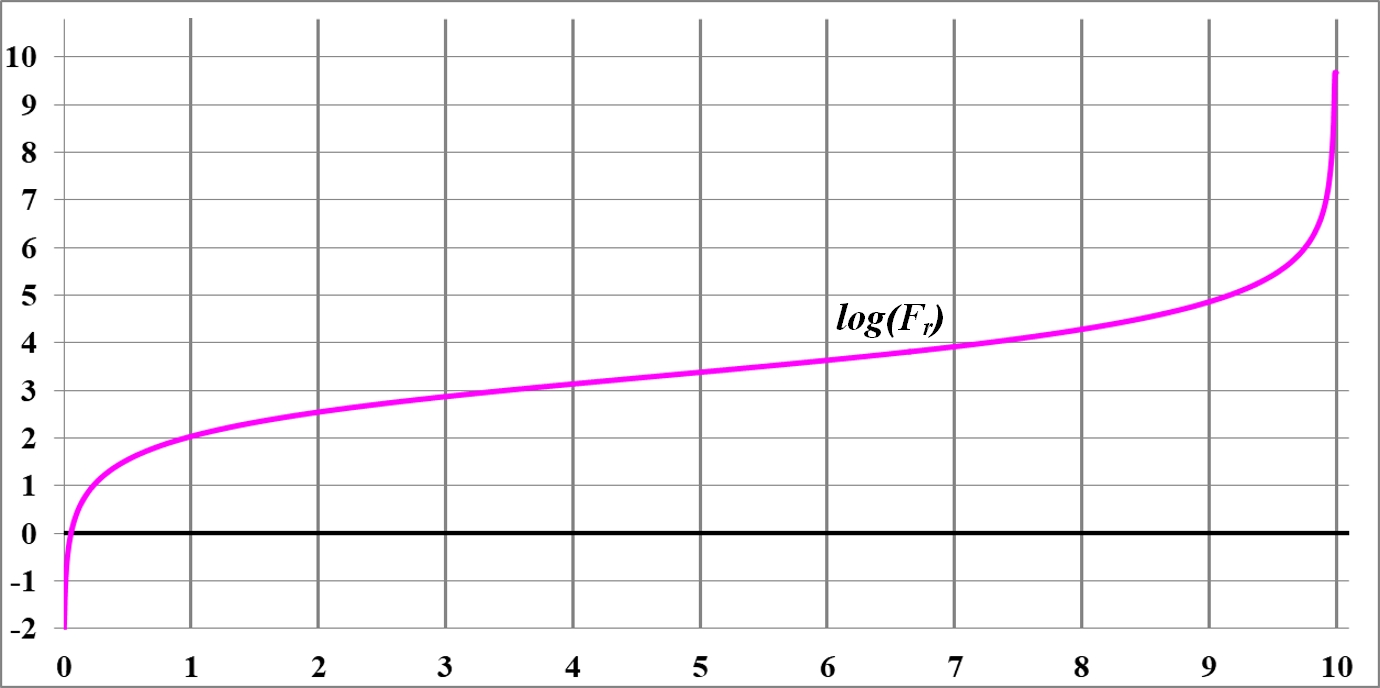 Рис.1.3. Логарифмический график изменения силы притяжения внутри обруча пробного тела в зависимости от его удалённости от центра