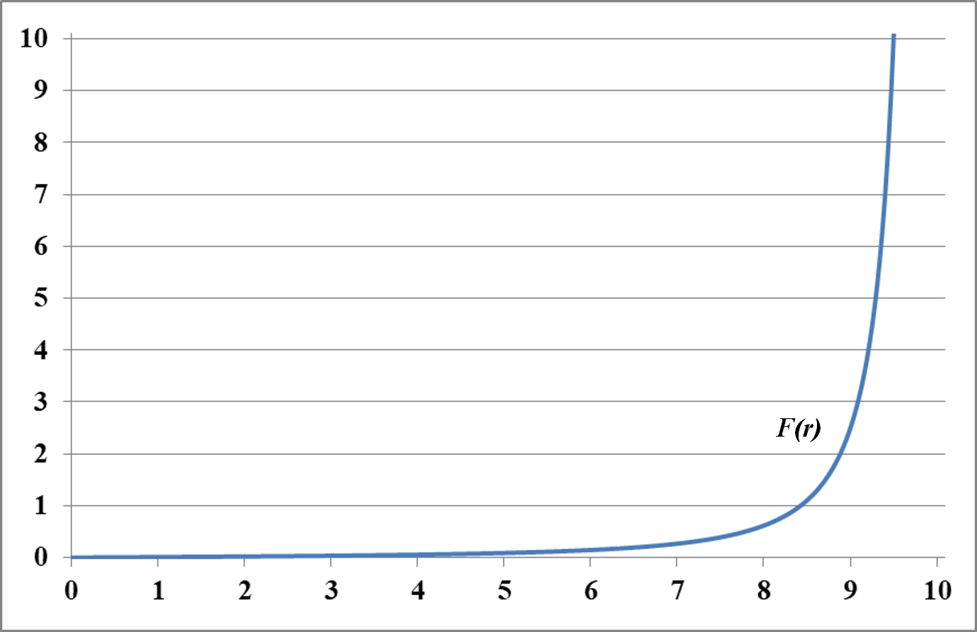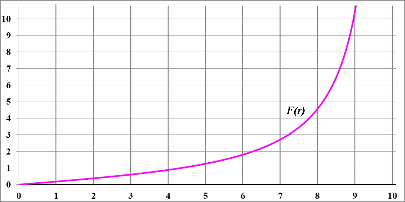 Рис.2.4. Логарифмический график изменения силы притяжения внутри сферы пробного тела в зависимости от его удалённости от центра