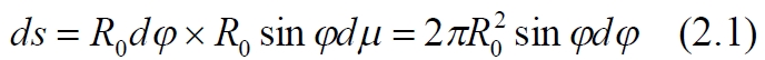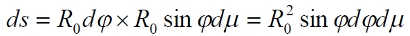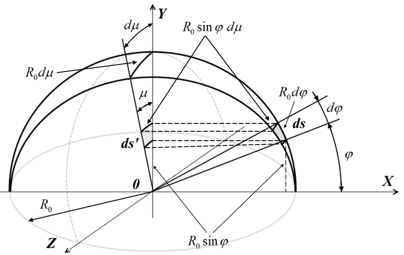Действительно, как видно на рисунке ширина дольки разная, в зависимости от угла φ. Самая широкая её часть находится в плоскости Z0Y, а вблизи плоскости Z0X ширина дольки сводится к нулю. Зависимость эта от угла φ описывается уравнением R0sinφdμ. Таким образом, площадь дифференциального участка сферы описывается уравнением