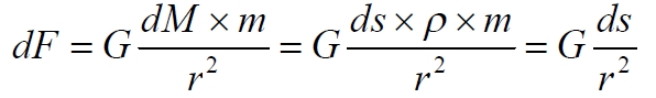 Дифференциал силы притяжения между пробным телом m и этим элементарным, дифференциальным участком сферы равна