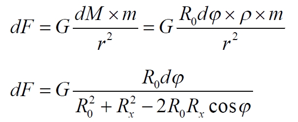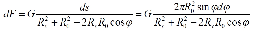 Вычислим силу притяжения тела массой m = 1, находящегося на удалении Rx от центра сферы радиусом R0. Каждый бесконечно малый, дифференциальный объём dv сферы массой dM притягивает тело m независимо от других её элементов, составляющих