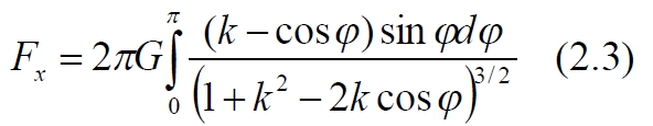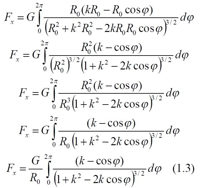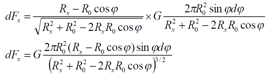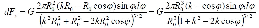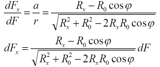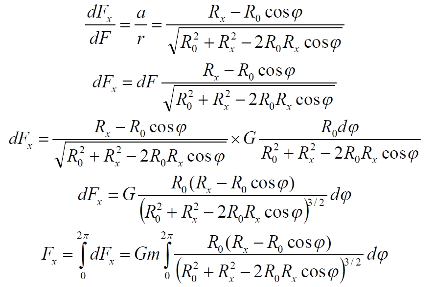 Эта дифференциальная сила раскладывается на две составляющие, из которых нас интересует только центральная dFx, по линии, соединяющей центры сферы и притягиваемого тела. Отношение этих сил равно отношению соответствующих сторон a и r подобного треугольника