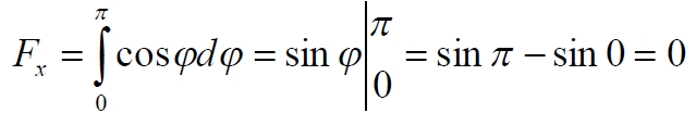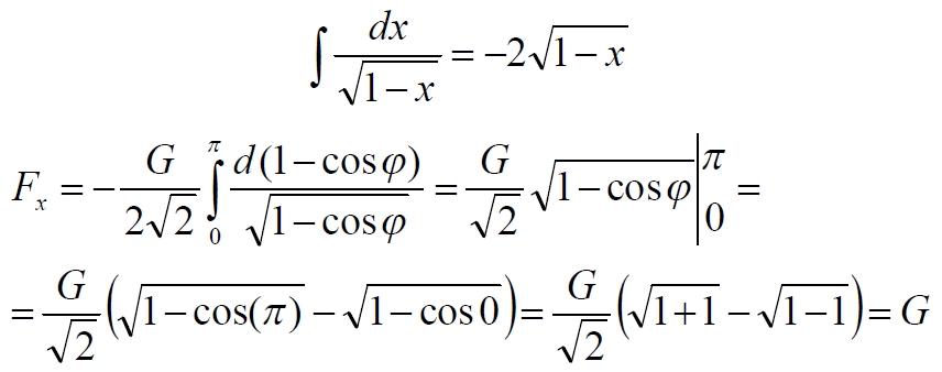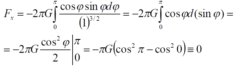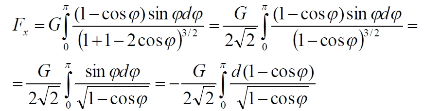 Результирующую силу находим интегрированием. Следует пояснить, почему мы выбрали именно такие пределы интегрирования. Дело в том, что всю сферу мы поделили углом μ на "апельсиновые дольки" и результирующую силу находим именно по силам, создаваемым этими дольками. Но, как легко заметить на рисунках, в этом случае другой угол – φ изменяется в пределах от 0 до π.