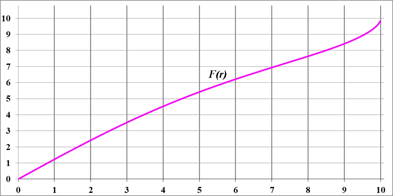 Рис.1.2. График изменения силы притяжения пробного тела внутри обруча в зависимости от его удалённости от центра. График приведён полностью