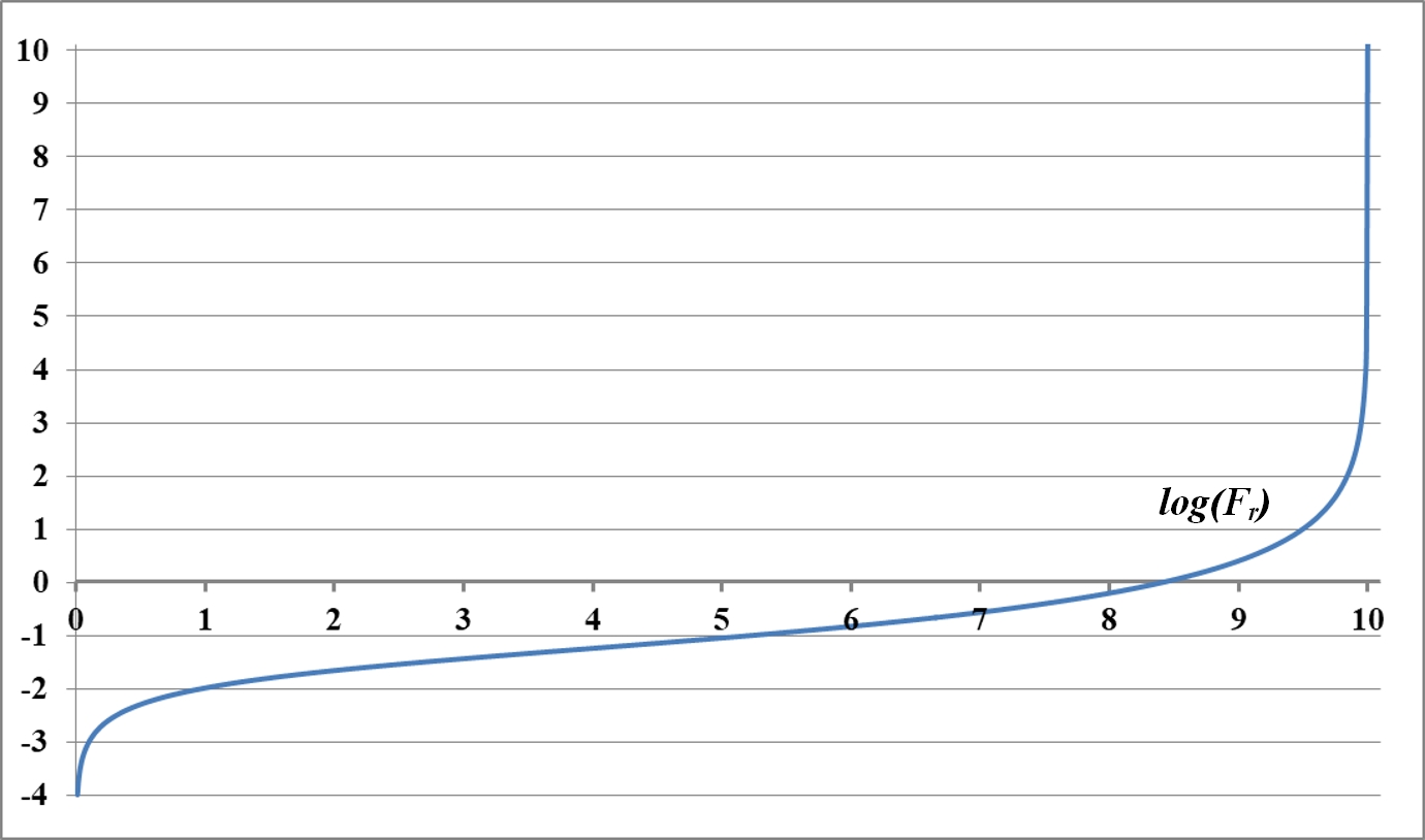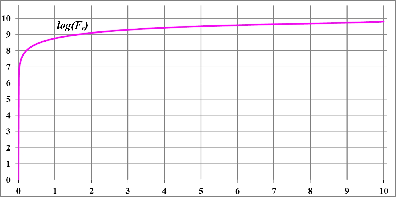 Диапазон изменения сил оказался слишком большим, поэтому график плохо просматривается. Все его значения почти на 95% длины радиусов выглядят нулевыми. Чтобы сжать график до размеров диаграммы, можно использовать логарифм величины. Понятно, что отрицательные значения в начале графика соответствуют его значениям, меньшим единицы.