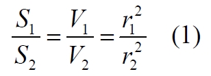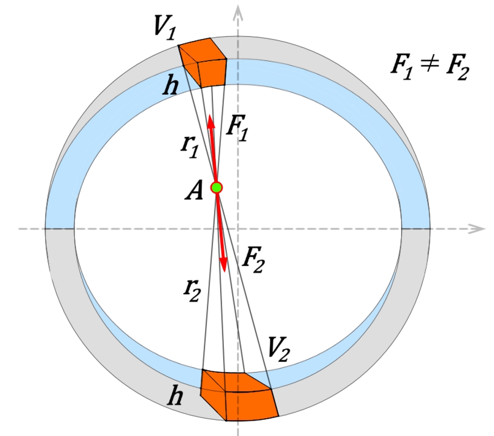 Рассматриваются силы притяжения, действующие на галактику A со стороны галактик, расположенных в этом слое в противоположных от неё направлениях, в объёмах элементов слоя V1 и V2. До этого момента рассуждения вполне корректны. Однако уже следующее утверждение является грубой ошибкой. При сравнивании объёмов элементов утверждается, что их угловые площади S1 и S2 и, соответственно, объёмы пропорциональны квадратам расстояний от галактики до поверхности слоя – r1 и r2. Приводится рисунок, на который мы сразу же добавили неравенство сил