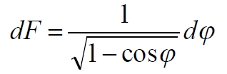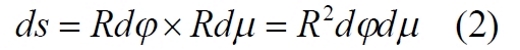 Напротив, другая сторона дифференциальной площади ds зависит от угла φ дважды – непосредственно, по образующей вдоль дольки и через зависимость ортогональной стороны, образованной углом dμ, зависящей также и от угла φ.