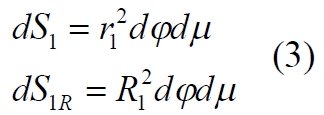 Автор допускает, вообще-то, очевидную небрежность, ошибку – это уравнение неверно. В нём проводится отождествление трёх разных сфер, имеющих радиусы R, r1 и r2. Каждая из площадей, дифференциал площадки, бесконечно малый участок на сфере определяется уравнением