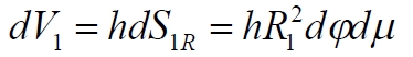 Считая, что полярные углы φ и μ для всех трёх сфер одинаковы, каждая из площадок, дифференциал площади, например, в (3) это S1, обозначена с "точки зрения" соответствующих сфер: сферы с радиусом R и началом координат в центре этой сферы, и сферы с радиусом r1 и началом координат в точке А. Но эти две площадки S1 и S1R не тождественны, они не равны друг другу, они не слились воедино. Следовательно, площадка S1 не принадлежит сферическому слою и, соответственно, не является элементом объёма V1. Исходному сферическому слою условно принадлежит объём