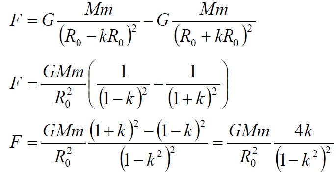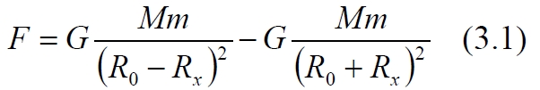 В данном случае мы придаём массам всех участников системы конечные значения. Расстояние между точками задаём равным 2R0. Удалённость тела m от центра между точками обозначим как Rx. Для удобства в уравнении (3.1) заменим значение Rx на его долю от R0, то есть, Rx = kR0, где k = 0…1. Преобразуем уравнение с учетом новых обозначений
