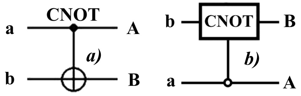 Помимо косвенной сверхсветовой сигнализации посредством телепортации состояния запутанности можно рассмотреть еще один гипотетический способ непосредственной сверхсветовой коммуникации. С этой целью удобно использовать квантовые гейты CNOT, которые позволяют получить состояние запутанности вместо параметрического распада. Математическое описание этого процесса достаточно наглядно. Схема гейта CNOT представлена на рис.1a – изображение, чаще всего используемое в литературе, на рис.1б – изображение гейта, использованного в схеме традиционной квантовой телепортации (перевернуто).