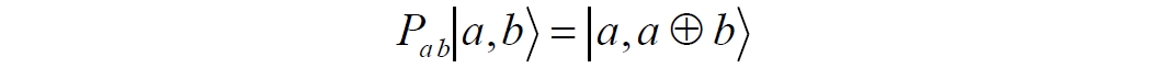 Обозначения входов и выходов перевернутого изображения гейта, используемого далее в схеме рис.2, полностью соответствуют его традиционной таблице состояний (ниже). Математически этот квантовый оператор описывается выражением: