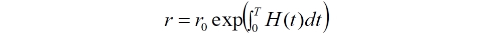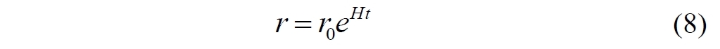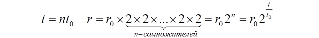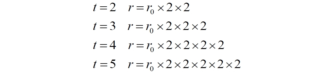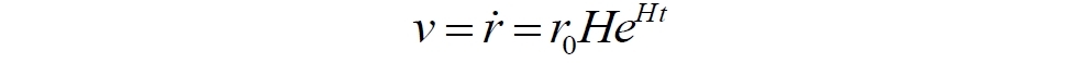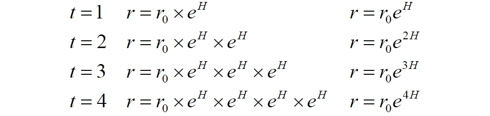 Удвоение атомов пространства является, видимо, чрезмерно завышенной величиной. Поэтому выберем некоторую константу, значение которой пока не устанавливаем. Поскольку конечный результат, надо признаться, нам вообще-то известен, в качестве константы возьмем величину eH, которую также назовём коэффициентом пространственного расширения. Пусть в начальный момент времени расстояние между двумя объектами (галактиками) равно r0. Согласно выбранной модели за каждую единицу времени количество атомов пространства будет возрастать в eH раз. Поэтому в каждый следующий момент времени расстояние будет увеличиваться. Продолжив вниз левый столбец в следующей таблице, обнаруживаем закономерность (средний столбец), которую переписываем в короткое уравнение (справа):