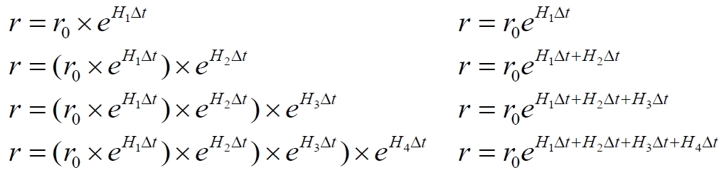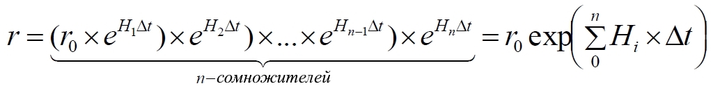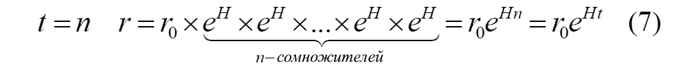 В первой строке показано, что расширение eHt испытал исходный интервал r0. Во второй строке расширение происходит теперь уже у этого уже расширившегося интервала в скобках. В третьей строке новым интервалом для расширения является итоговый интервал из второй строки. И так далее. Закономерность очевидна, она имеет вид: