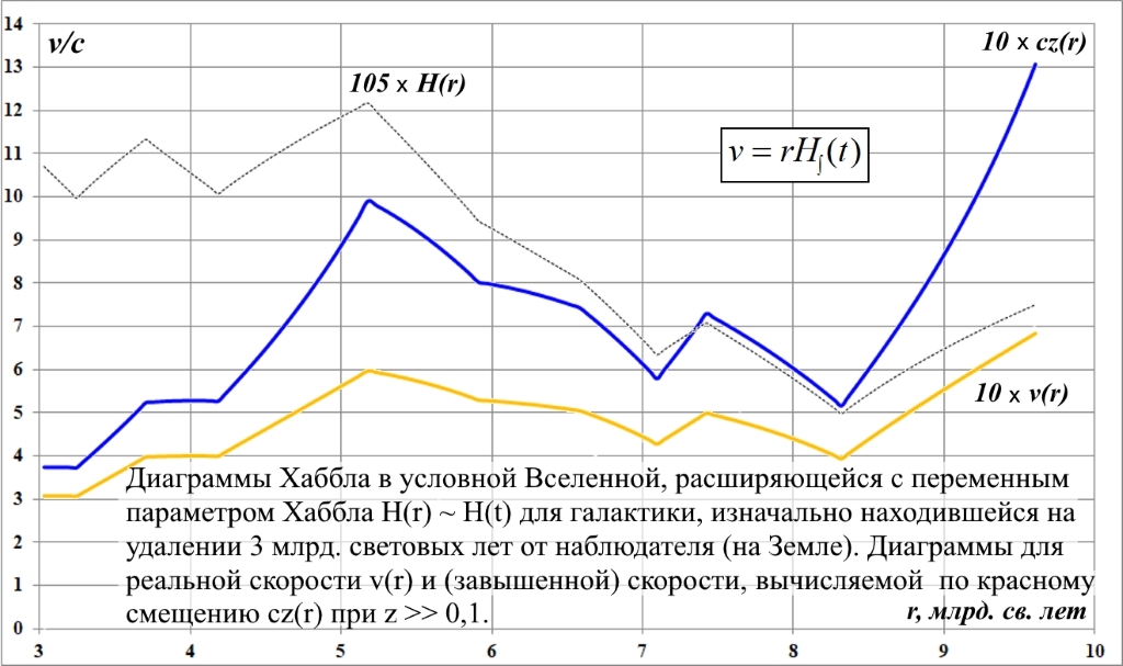 На рис.1 этот переменный параметр Хаббла представлен графиком 105xH(t), где масштабный множитель 105 использован, чтобы график был хорошо различим, а его некруглое значение – чтобы он имел меньше пересечений с другими графиками. Интервал времени диаграмм равен 14 млрд. лет.