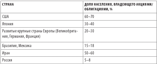 В последние годы в России в этом плане ситуация стала изменяться в лучшую сторону – процесс освоения финансовой грамотности заметно ускорился. Однако, несмотря на десятикратный рост в ХХI веке доли населения, владеющего ценными бумагами, эта цифра пока весьма скромна по сравнению не только с развитыми странами, но и с государствами нашего уровня развития (табл. 1.2).