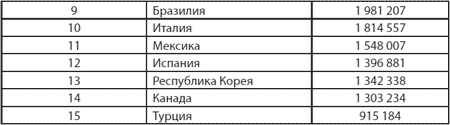 По объему золотовалютных резервов Россия в первой тройке (см. табл. 1.3). Десяток стран мира хранят около 50 % от общих золотовалютных резервов. Показатель финансовых резервов лишь косвенно говорит об экономической ситуации в стране. Не случайно в первой десятке лишь две страны, которые относятся к категории развитых (Япония и ФРГ).