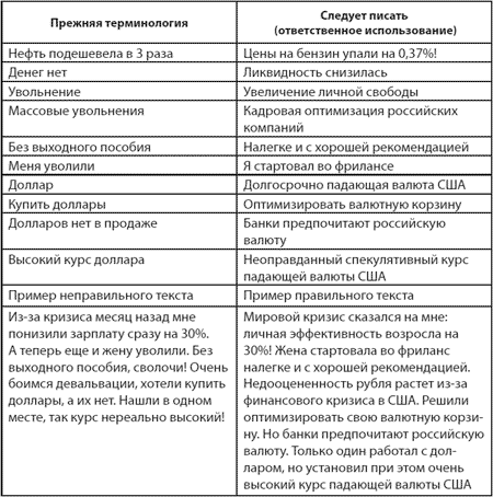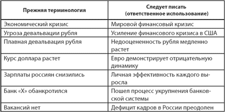 Что и как говорить, во многом зависит от выполняемых функций и сферы имеющейся ответственности. Например, в устах простого добродушного человека призыв: «Помолитесь Богу, он иногда и чудеса творит» может звучать уместно. Однако в устах лечащего врача такой совет означает необходимость спешно звать нотариуса (для заверения завещания), ибо пользы от врача нет уже никакой. В связи с этим, несомненно, полезен не просто глоссарий используемых терминов, но и памятка для социально ответственных интернет-блоггеров и журналистов. Ряд разработок для «заговаривания» кризиса появился в отечественном Интернете в конце 2008 года. В схематичном виде «ново-ответственную» терминологию можно представить в виде таблицы (табл. 1.4).