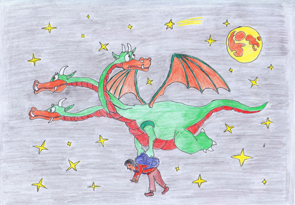 Мальчик понял, что сейчас не парит в небе и даже не спит. Схватив мощными лапами за рюкзак, его куда-то вёз большущий зелёный Змей Горыныч. Две головы его смотрели вперёд, а третья следила за новоиспечённым заложником.