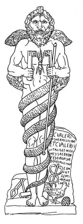 На этом фрагменте изображения сделанного с Древнего мраморного барельефа показан змеюноша-ангел Митра (Пернатый Змей), с головой тигра-кота (из двухтомника «Мифы народов Мира»). Он сошёл с Неба, как Спаситель и Заступник Мира, в его руках ключи Жизни и Смерти. За его спиной в нижней части барельефа иллюстрация к его самой замечательной «сказке» о волшебном «Яичке» – Алатыре (похожее на шишку-яйцо из металла внизу) и Курочке Рябе («Мифы народов мира»).